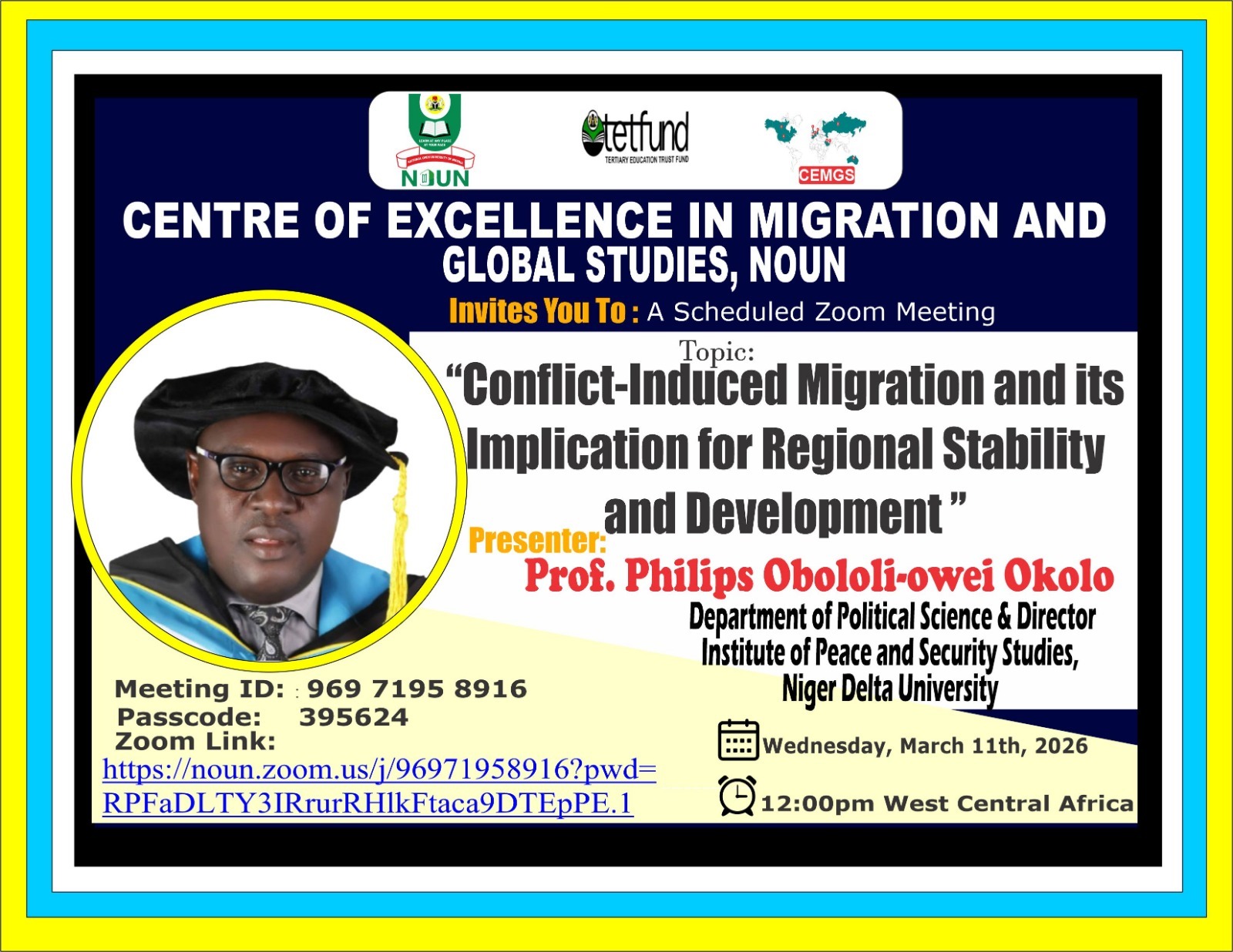CENTRE OF EXCELLENCE IN MIGRATION AND GLOBAL STUDIES NOUN is inviting you to a scheduled Zoom meeting.